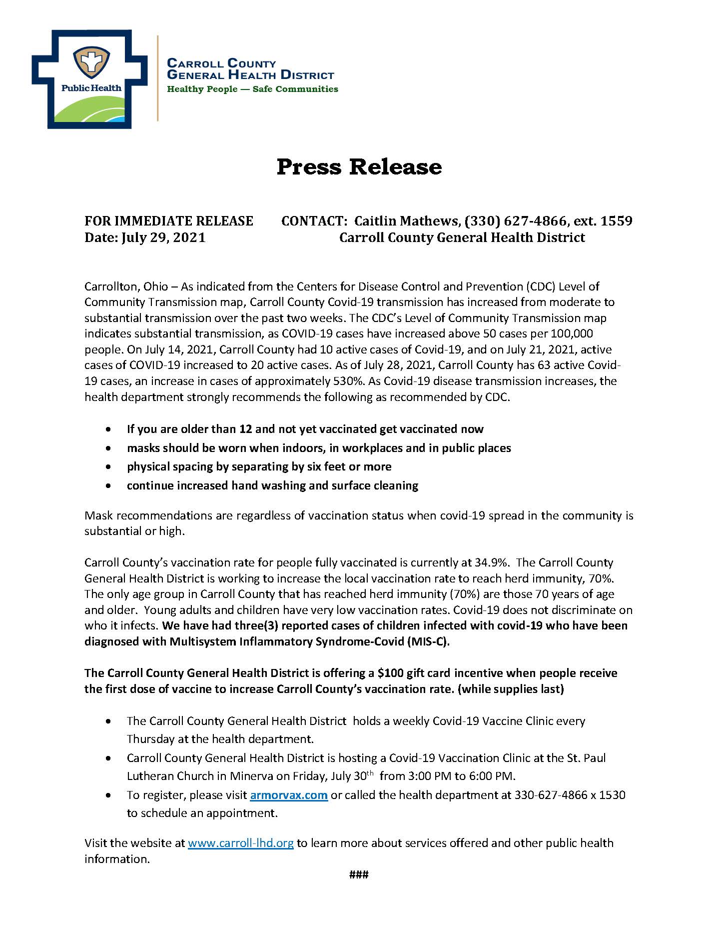 The Health Department is currently offering all three COVID-19 vaccines approved in the US. Most services can be completed over the phone. The Carroll County Health Department is recommending that all people over the age of 2 regardless of vaccination status wear a mask indoors in public and crowded outdoor settings to reduce the spread of the Delta variant of COVID-19.